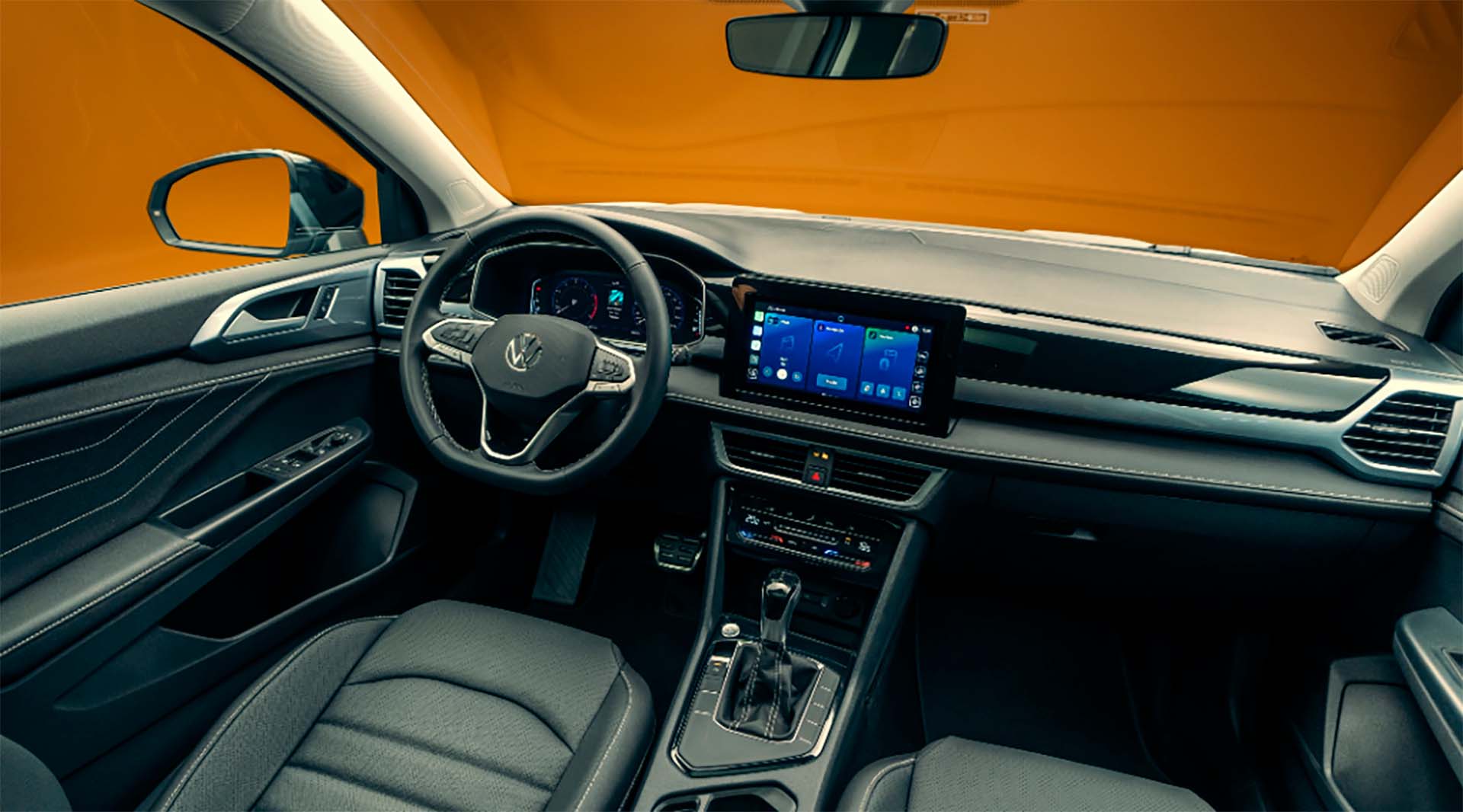 Puertas adentro, el restyling del Taos ofrece asientos, tablero y puertas con una nueva tapicería premium, con costuras en contraste, luz ambiental con 10 opciones de color y la nueva construcción del tablero. La nueva pantalla VW Play Connect de 10.1 pulgadas ahora es flotante, acompañando al aire acondicionado digital de dos zonas y al cargador de teléfono celular de inducción. El volante retoma los botones físicos y añade interacciones de conectividad y seguridad al alcance de su mano.