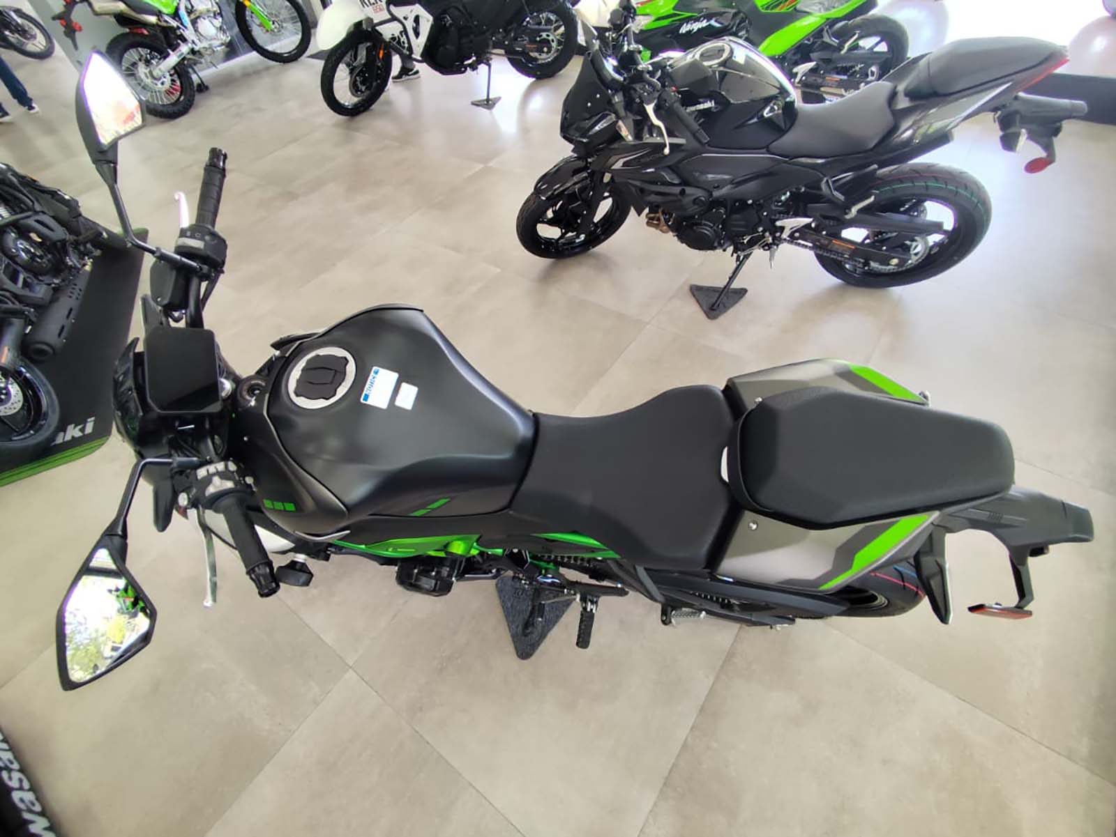 El asiento, confeccionado con material texturado, mejora el agarre durante la conducción y cuenta con un aplique de aluminio con el logotipo Kawasaki en relieve. El asiento trasero se integra al colín, que ofrece además un pequeño compartimiento de guardado.