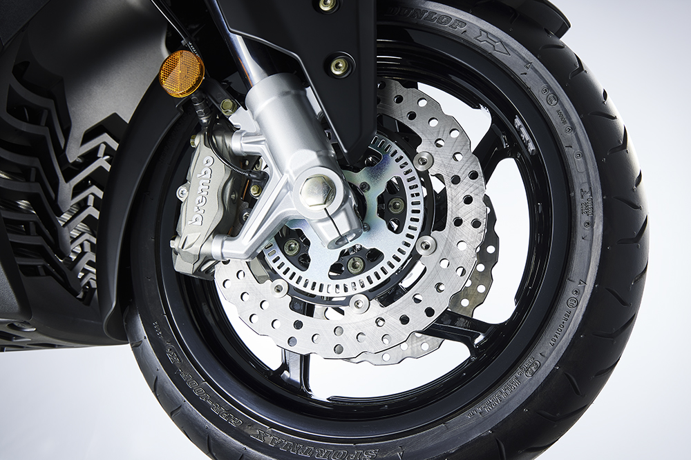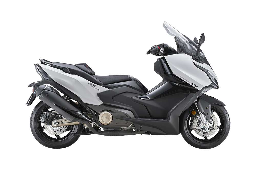 El Kymco AK 575 Premium incorpora un bicilíndrico 575 cc refrigerado por líquido que declara 52 CV y 56 Nm de torque, acoplado a una caja CVT. Su frenado combina doble disco delantero de 270 mm (con pinzas Brembo) y disco trasero de 260mm, gestionados por un ABS Bosch 9.3 con función cornering (AIBS).