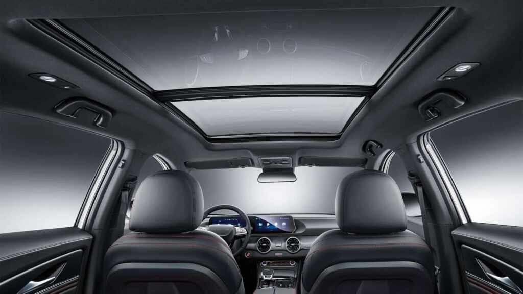 En equipamiento ofrece faros de Led, espejo exterior con luz de bienvenida, luces ambientales, techo panorámico, llave inteligente, encendido por botón, retrovisores con plegado automático, ajuste eléctrico del retrovisor, alzacristales eléctricos, portón eléctrico, pantalla de 10,25″, conectividad WIFI y Bluetooth, asientos de cuero, ajustes eléctricos, entre otros.