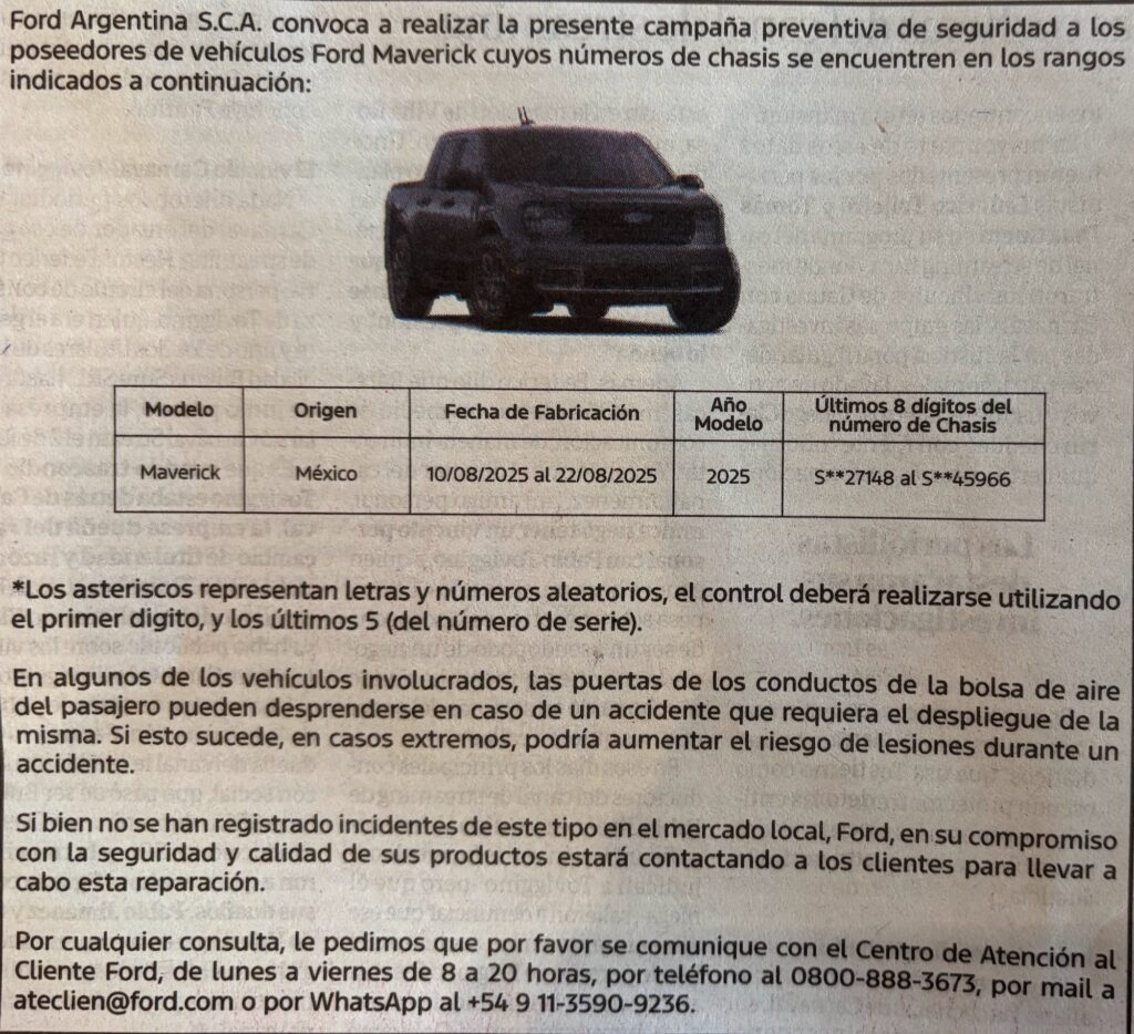 Ford Argentina anunció un recall preventivo que involucra a la pick-up Maverick modelo 2025, luego de detectar un inconveniente vinculado al sistema de airbag del pasajero. El llamado a revisión fue comunicado oficialmente a través de avisos publicados por la marca.