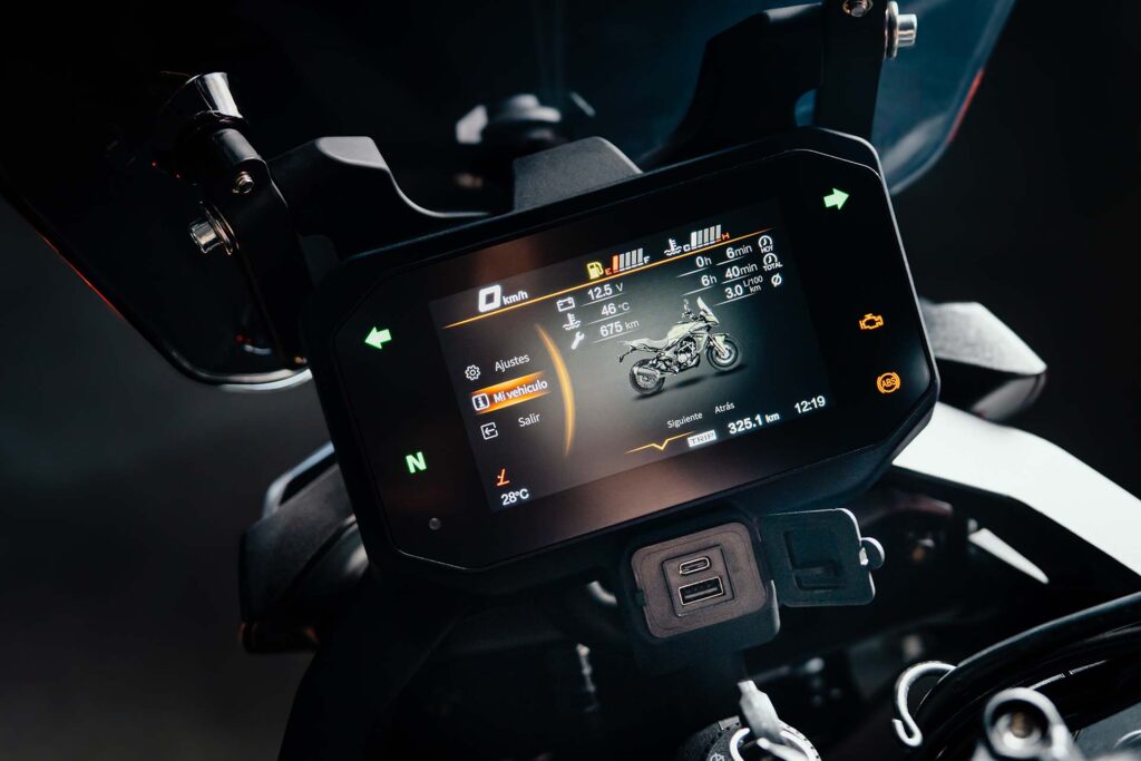 Para conocer todo el sistema, la Voge 300DS cuenta con display TFT color de 5 pulgadas, con dos modos de visualización e información completa del vehículo. La conectividad Bluetooth de la moto permite visualizar llamadas entrantes y notificaciones directamente en el tablero.