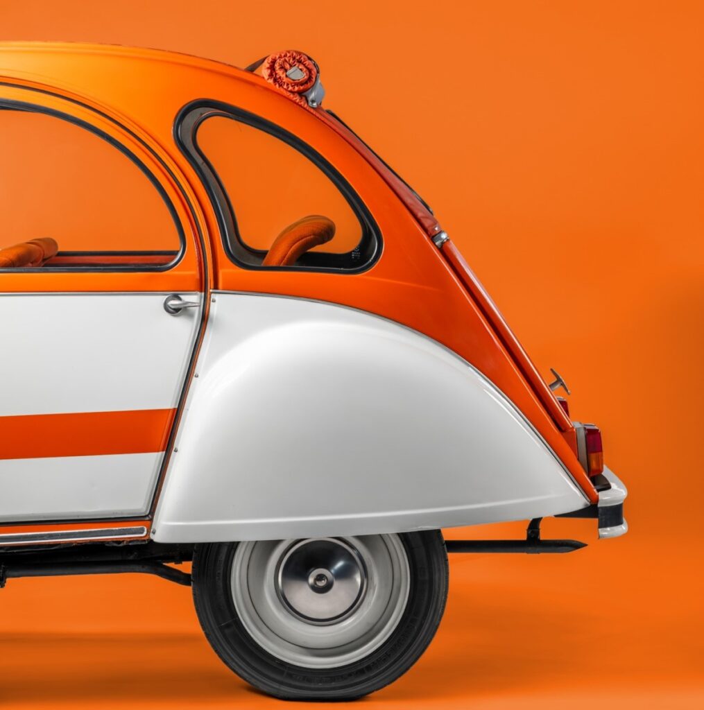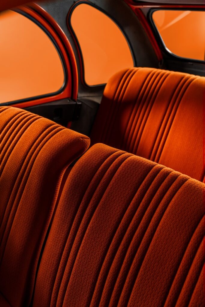 Lo que llama la atención ante todo en el 2 CV Spot es la coherencia de su identidad. Cada detalle está pensado para formar un conjunto armonioso: la carrocería bicolor en Orange Ténéré y Blanc Meije, la capota rayada en naranja y blanco fijada sobre los asientos delanteros, los paneles de las puertas con el mismo motivo bicolor, los embellecedores de las llantas de acero inoxidable tomados del Dyane y la tapicería de tejido jersey Orange Vénitien con asientos delanteros separados.